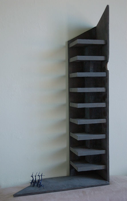 four birds looking at third floor /wood, ink, wire, sandpaper /60cm height /2014