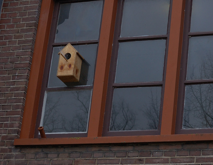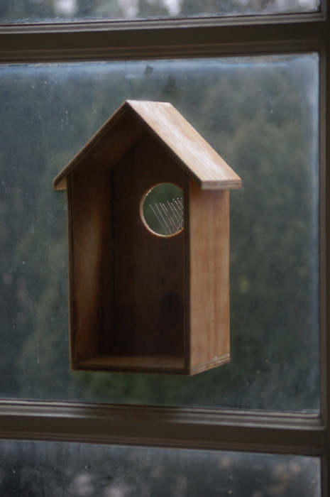 empty birdhouse /2009 /wood, wire /33cm height /suspended on a window