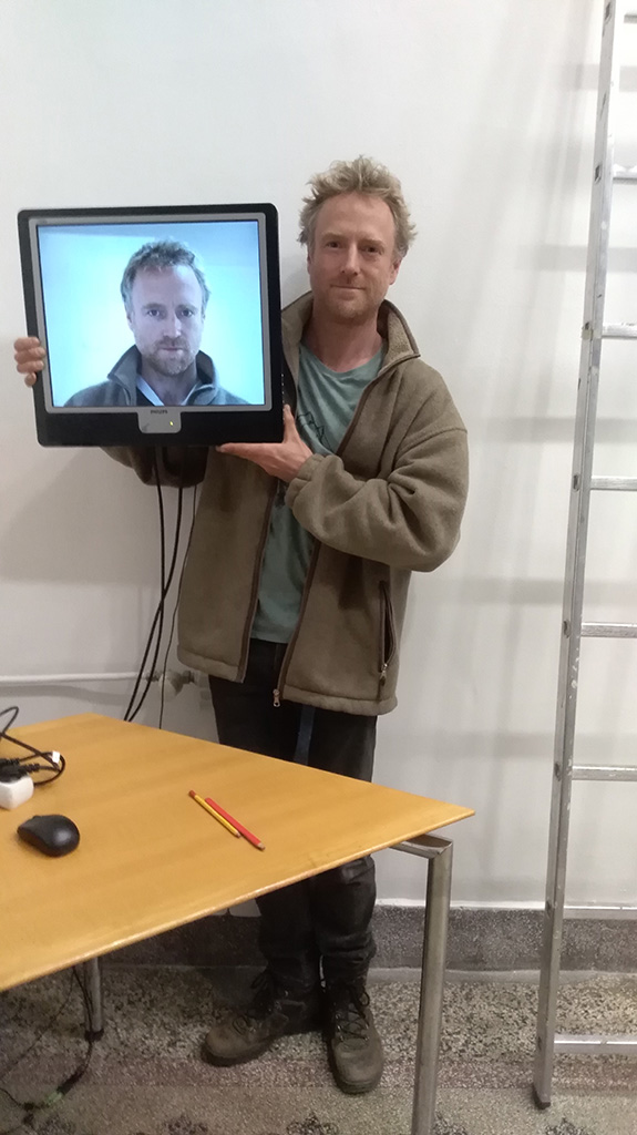 Small Talk Workshop /2023 /two channel synchronized video /exhibition view, few excerpts from the full 17min38sec The author asked some of his mostly artist friends to send him written dialogues of “small talk” conversation, which is supposed to take place at an imaginary exhibition opening. Then the dialogues were “performed” for the camera – as if the two participants are practicing – exercising their “small talk” skills, appearing as two monitors "talking" to each other... Small talks performed by: Ruud Matthes and Terry Vreeburg, german small talk performed by: Ralitsa Gerasimova and Adrian Nikolov Small talk dialogue contributions by:Dimitar Stoyanov, Emil Daynov, Mladen Stropnik, Valentina Sciarra, Ruud Matthes, Terry Vreeburg, Lisa Smithson, Lee McDonald, Andrei Ionescu, Miná Minov, Henrik Kröner "Gaze redirection" AI software was used to make the eyes of the performers stare into the camera...