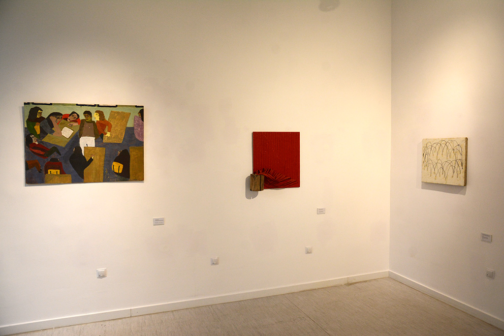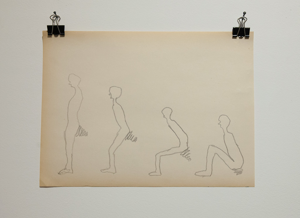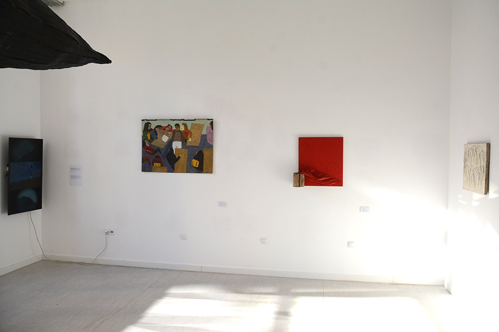 exhibition view with: Students /2001 /tempera on paper, Unmarketable object /2022, Untitled (up and down) /2015