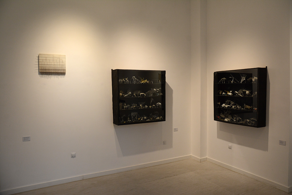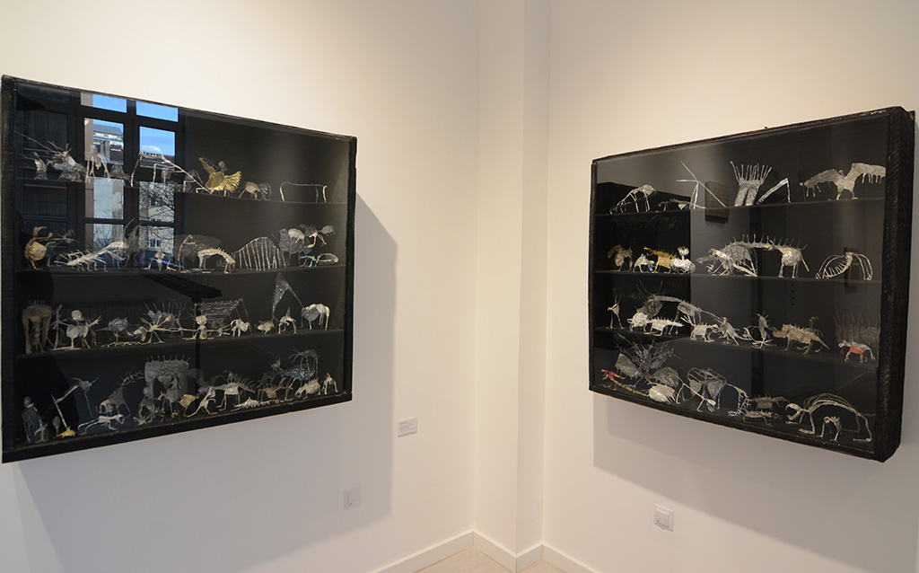 1990-2005 vitrines 1 and 2 /98x98x27cm, 97х97х20cm /aluminium foil figurines, boxes from found wood