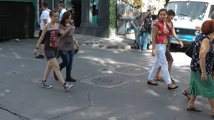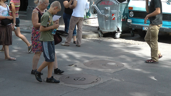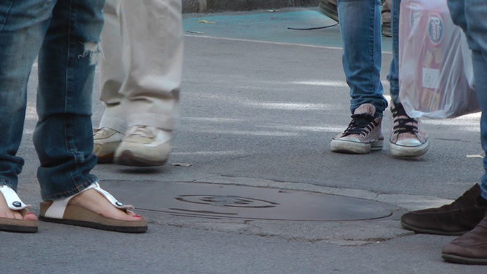 manhole /sound installation /2011 presented as part of Sofia Breathes art festival, in August 2011, speaker installed underneath a manhole cover, audible noise of suitcase dragged over the streets of Sofia, and few words in between.. loudness barely noticeable by some random passers-by.