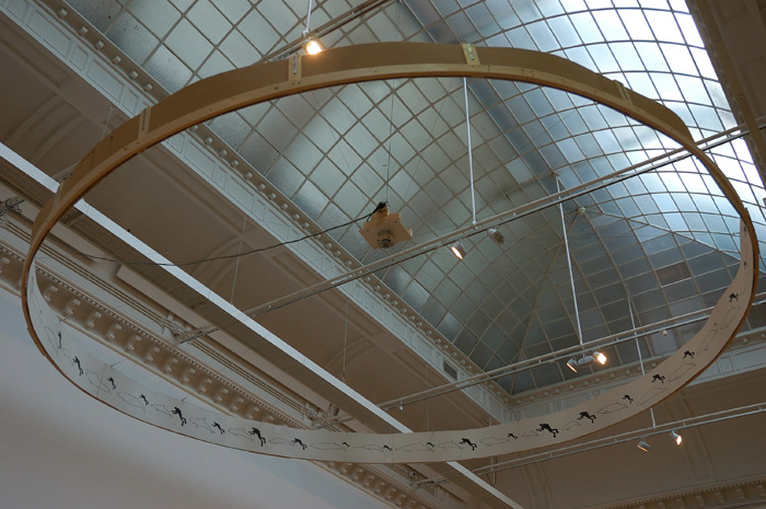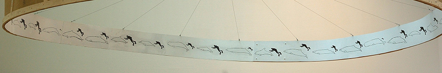 untitled (cetacea) /2009 /ink on carboard, electric motor, steel strings /360cm diameter, suspended about 2m above the floor. Drawings on the inside taken from different encyclopaedia articles on Cetacean - marine mammals. Originally meant to represent the scale of each animal's body paired next to human - "diver" sihlouette. Put all together sense of scale becomes altered, animals' bodies appear relatively equal while "divers" become variable in size...
